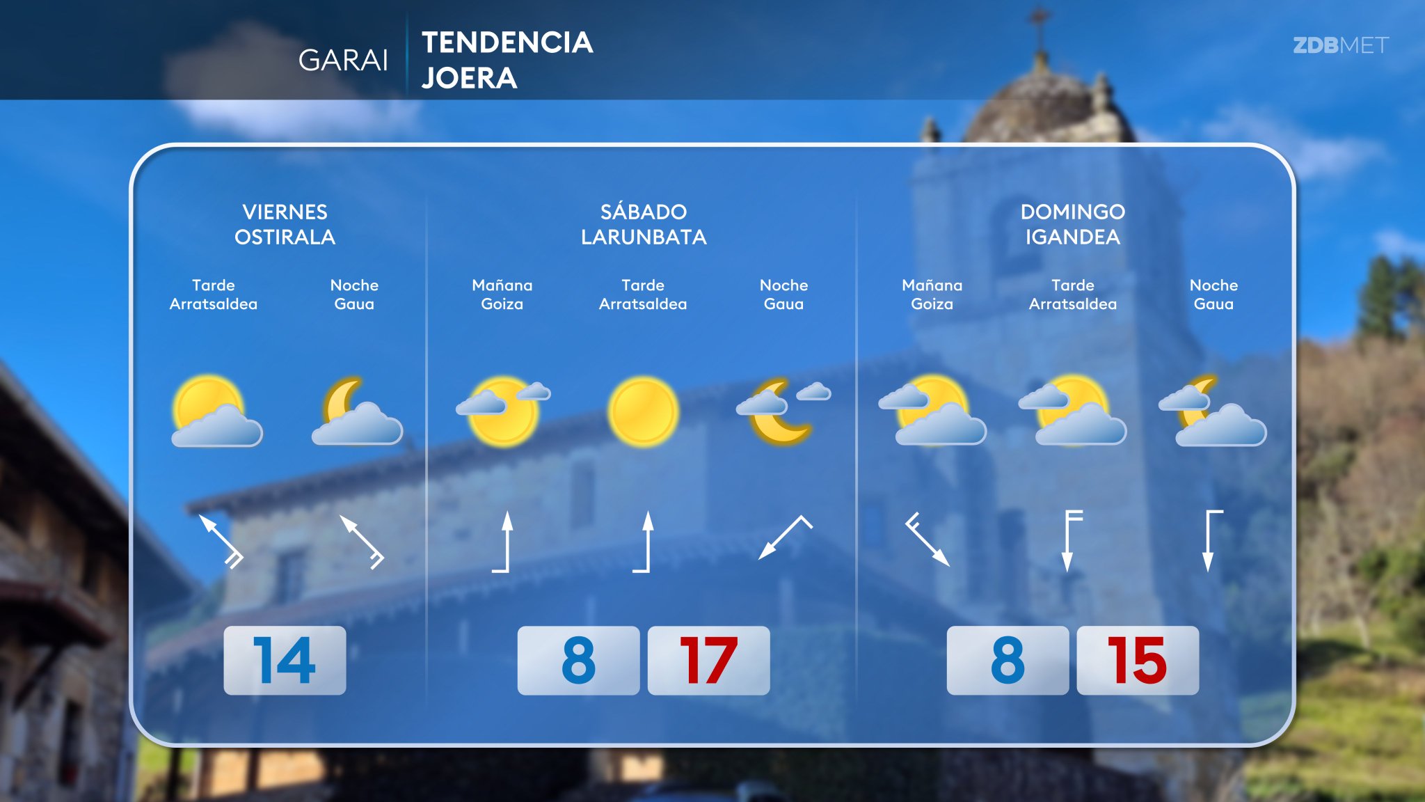 El viernes irá mejorando a lo largo del día. Durante la mañana nubes abundantes en el norte, donde además lloverá de forma débil. Durante la tarde, sin embargo, remitirán las lluvias y se abrirán claros. La mitad sur de nuevo con ambiente más soleado. Predominarán los vientos de componente norte. Temperaturas en descenso, excepto en sur de Álava y Navarra.