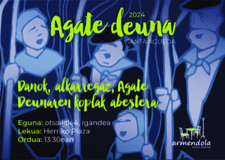 AMOREBIETA-ETXANO | Armendola Kultur Alkarteak aurreko urteetan bezala, aurton be, herriko abesbatzak eta herritar guztiak deitu gura dute Agate Deun egunaren bezperan, otsailaren 4an, domekan, Herriko Plazan egingo doten alkarretaratzera, 13:30ean batuko dira. Bertan, abesbatza bakotxak bere koplak abestuko dauz eta gero danok alkarregaz amaituko dogu.