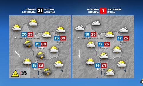 EGURALDIA | Final de mes con ambiente marcadamente inestable. La mañana del sábado los aguaceros nos darán una tregua e incluso tendremos ratos para disfrutar del sol y las temperaturas serán prácticamente veraniegas. Pero durante la tarde volverán los chubascos y las tormentas, puntualmente pueden ser intensos y venir acompañados de granizo. Los vientos soplarán débiles de componente este, con toques de componente norte por la tarde en la zona cantábrica. Las temperaturas subirán y seguiremos con cierta sensación de bochorno.