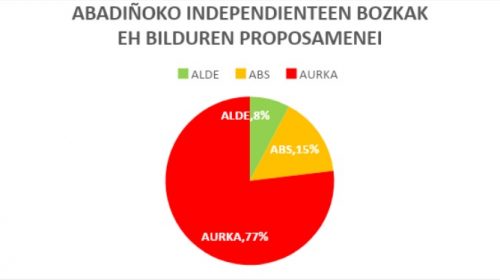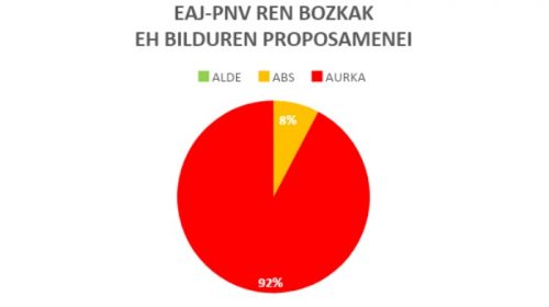 - EH Bilduren mozioen aurrean: AIk aldeko botoa eman du ( % 8), abstenitu egin da ( % 15) eta kontra bozkatu du ( % 77). EAJ % 8 abstenitu da eta % 92k kontra bozkatu du. EAJk ez du eh Bilduren proposamenen alde bozkatu.