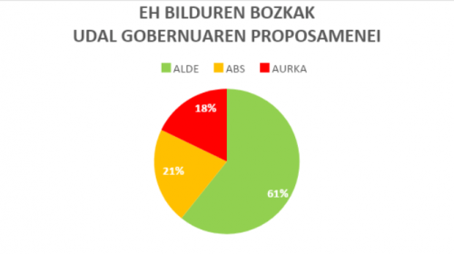 - Gobernu taldearen proposamenen aurrean, EH Bilduk aldeko botoa eman du ( % 61), abstenitu egin da ( % 21) eta kontrako botoa eman du ( % 18).