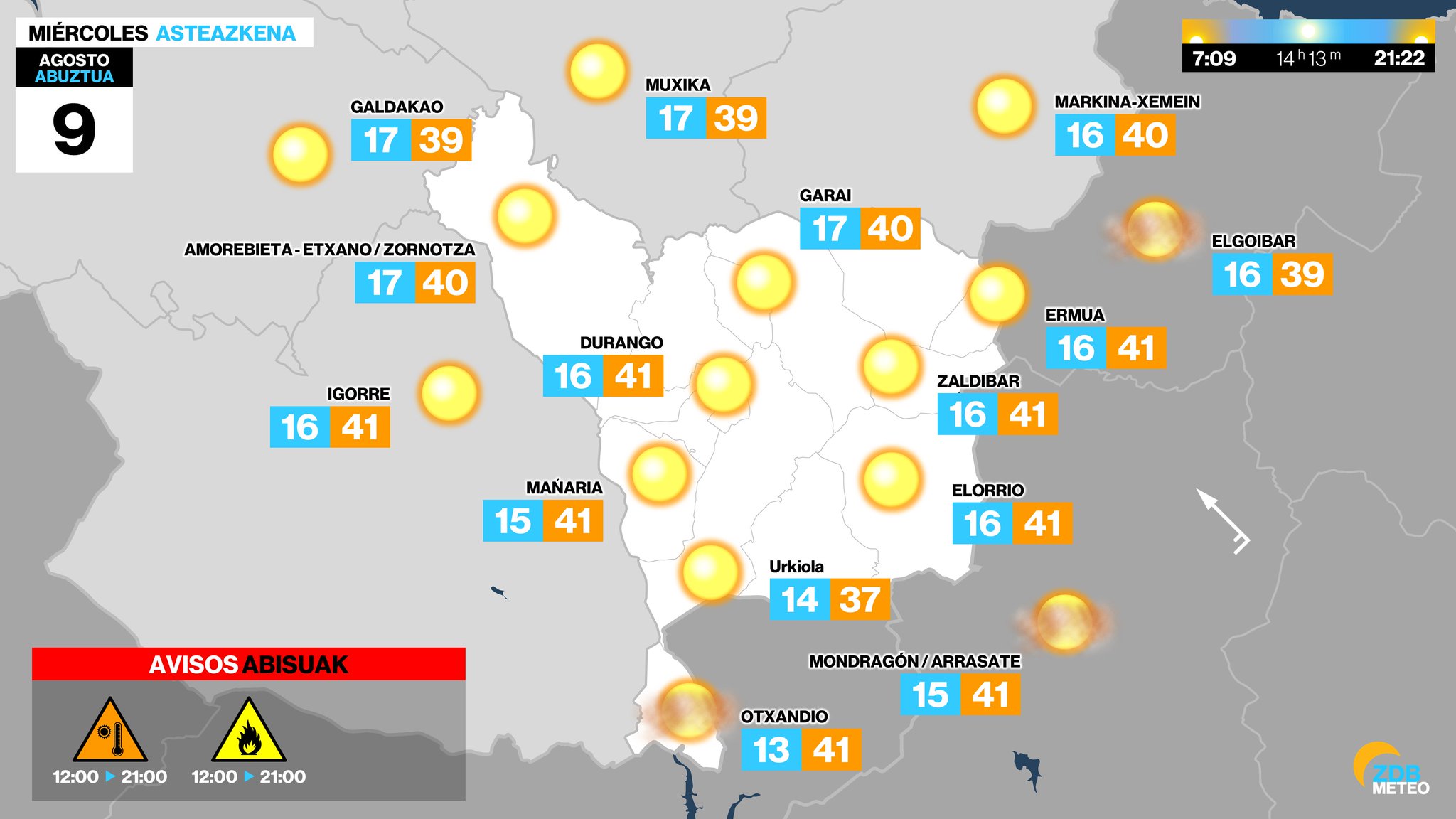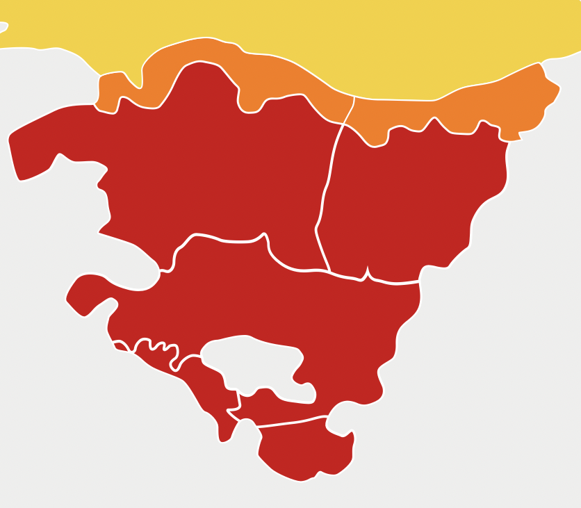 EGURALDIA | Euskalmet ha elevado esta mañan a roja la alerta por altas temperaturas que podrían superar los 40 grados en Duragaldea. Hoy miércoles será una jornada será muy calurosa. En puntos de la costa, sobre todo en el este, la entrada de la brisa dejará las temperaturas ligeramente más bajas. El cielo estará prácticamente despejado, eso sí, durante la tarde se formarán nubes de evolución y sin descartar algún chubasco tormentoso puntual en el territorio. Al final del día el viento podría girar a oeste-noroeste, con cierta intensidad en la costa.