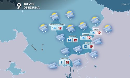 EGURALDIA | El jueves el ambiente será gris y algo lluvioso, especialmente en la mitad norte. Predominarán las nubes bajas y se registrarán lluvias débiles en distintos momentos del día, más frecuentes en la vertiente cantábrica. En el sur de Álava y en el centro y sur de Navarra la lluvia será poco probable y el cielo se mostrará más variable, con algunos claros. Las temperaturas máximas continuarán descendiendo, situándose en torno a los 18-20 ºC. El viento soplará del noroeste y del norte, con intervalos de intensidad moderada o fuerte.