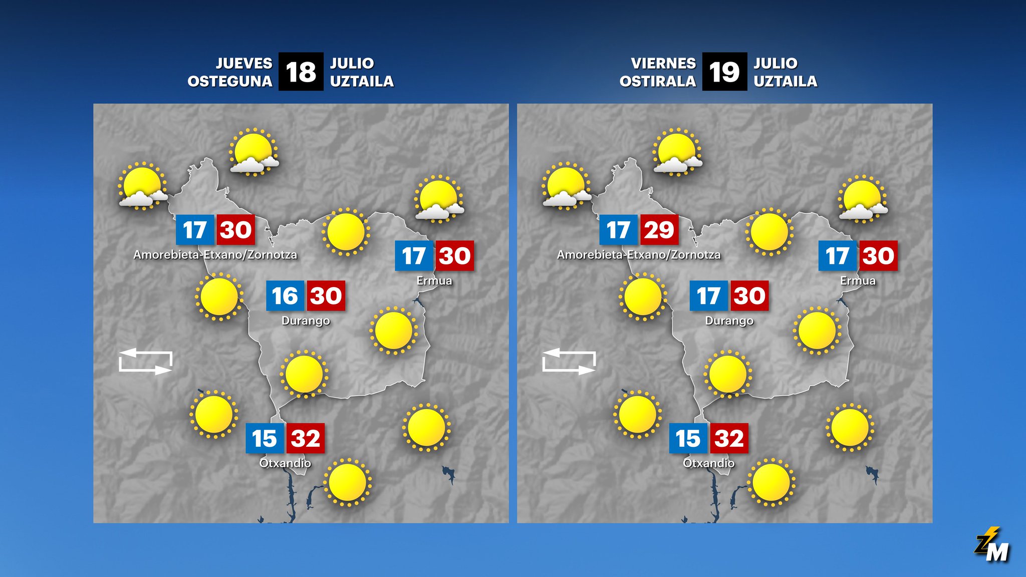EGURALDIA | El jueves seguiremos con ambiente veraniego. El cielo estará poco nuboso o despejado por la mañana y el viento será flojo y variable. Durante la tarde el viento se fijará del noroeste en el litoral y pueden aparecer algunos intervalos de nubes bajas. Temperaturas sin muchos cambios, con máximas en torno a los 24-25 ºC en el litoral y por encima de los 30 ºC en el interior, donde Euskalmet activará el aviso amarillo. El calor será más acusado en el valle del Ebro donde las máximas podrían superar los 35 ºC.