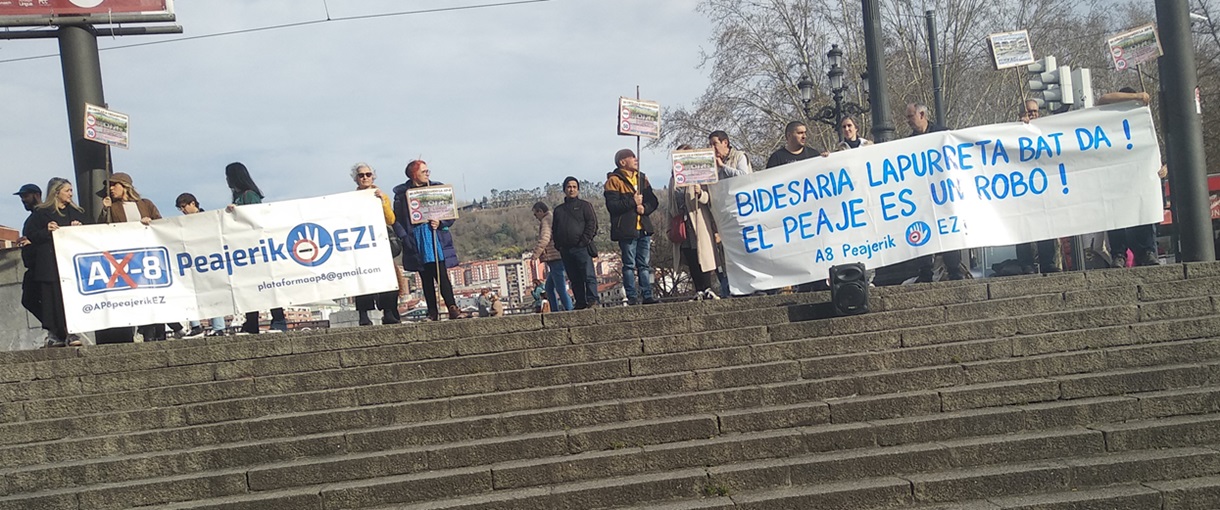 BILBAO | En la mañana de ayer domingo, miembros de la plataforma AP-8 Peajerik Ez, se concentraron en la plaza Arriaga para protestar por los injustificados peajes en la AP-8. La elección del lugar se debía a que el PNV hacía entrega, en el teatro Arriaga, de los premios Sabino Arana. Mostraban con ello, ante la ciudadanía y sobre todo ante los múltiples cargos de Diputación y Gobierno vasco que acudían al acto, lo que vienen reclamando como demanda popular: El fin de la política de imposición de peajes, cómo sobre impuesto, y el derecho a una movilidad segura y eficiente, sin tener que pasar por caja.
