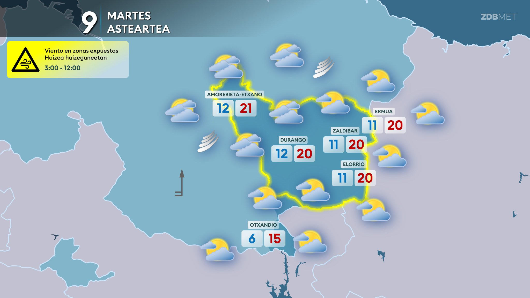 EGURALDIA | Viento intenso del sur para el martes, especialmente durante la primera mitad del día; se hará notar en todas partes, pero sobre todo en zonas expuestas del noroeste. A partir de la tarde el viento perderá fuerza y terminará soplando flojo a últimas horas del día. Nubosidad en aumento a lo largo del día; se irá nublando a medida que pasen las horas, empezando por la vertiente cantábrica, y puede llover a últimas horas. Temperaturas algo más altas en la vertiente cantábrica, con máximas en torno a los 20 ºC; sin cambios en la mitad sur.