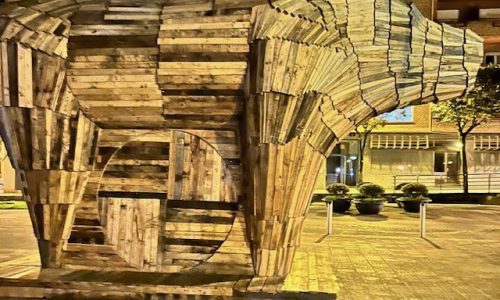 La escultura, realizada íntegramente con madera reutilizada, principalmente de palets de pino local sin tratamiento, fue instalada durante la primera quincena de diciembre de 2023. «Con unas dimensiones de aproximadamente 4 metros de altura y una base de 6×3 metros, el “Mikeldi” fue concebido como una obra efímera para ser expuesta durante el mes de diciembre del mismo año«, explican fuentes municipales.