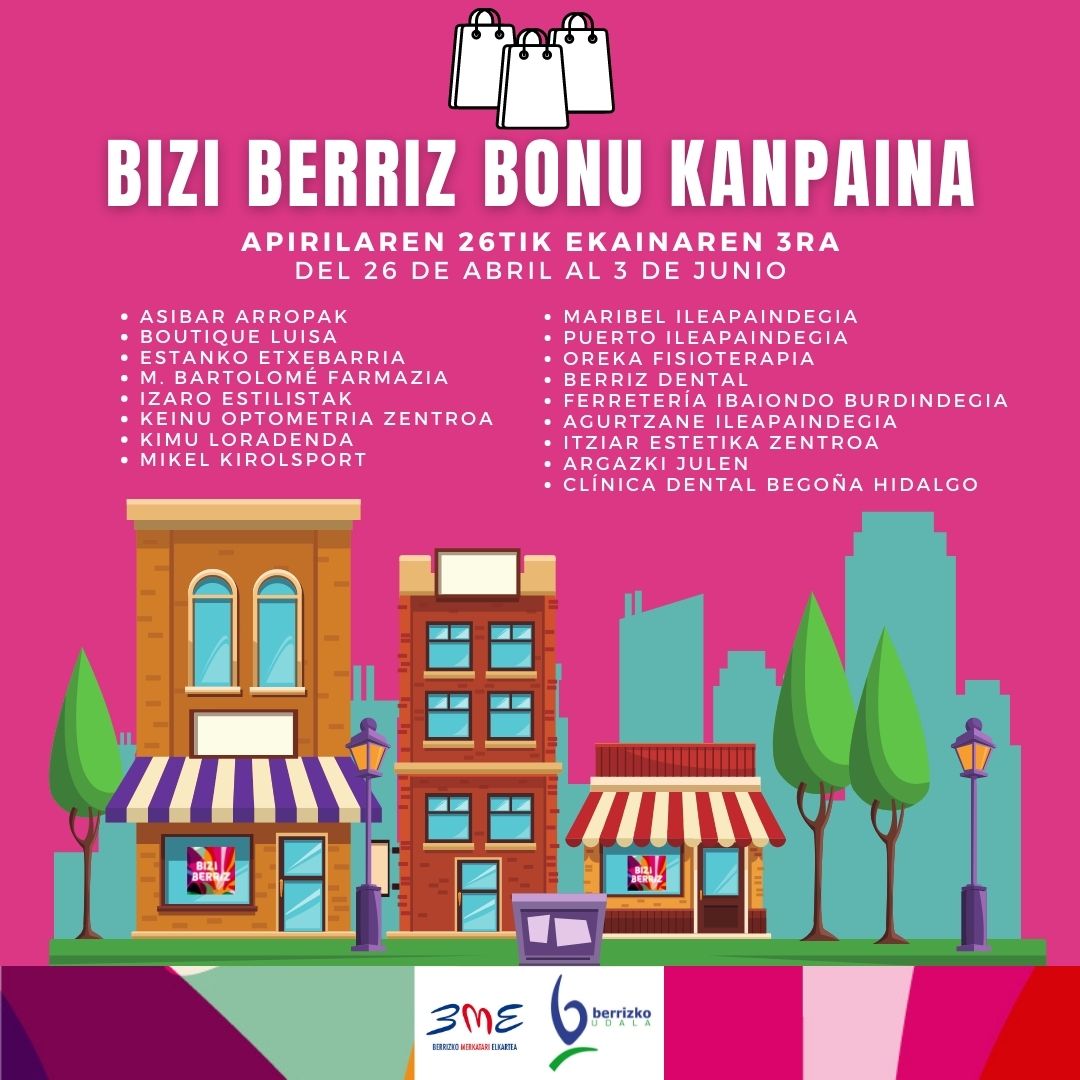 de Berriz han vuelto a poner en marcha una nueva campaña de bonos comercio. La cuarta campaña bonos comercio volverá a llevar por lema ‘Bizi Berriz Bonu Kanpaina’ y se desarrollará desde mañana, 26 de abril, hasta el 3 de junio. En total hay disponibles 530 bonos, con un coste de 30 euros y un valor de compra de 45 euros.