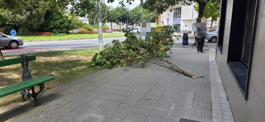 Hace una semana caía también otra rama en las casas de Mendizabal, por la calle Alluitz y en julio otra de grandes dimensiones se desplomaba también en los jardines de Pinondo, sobre una de las farolas que sufría daños importantes. Al parecer la fuerte tormenta de junio provocó la rotura de esta rama que caía al suelo días después.