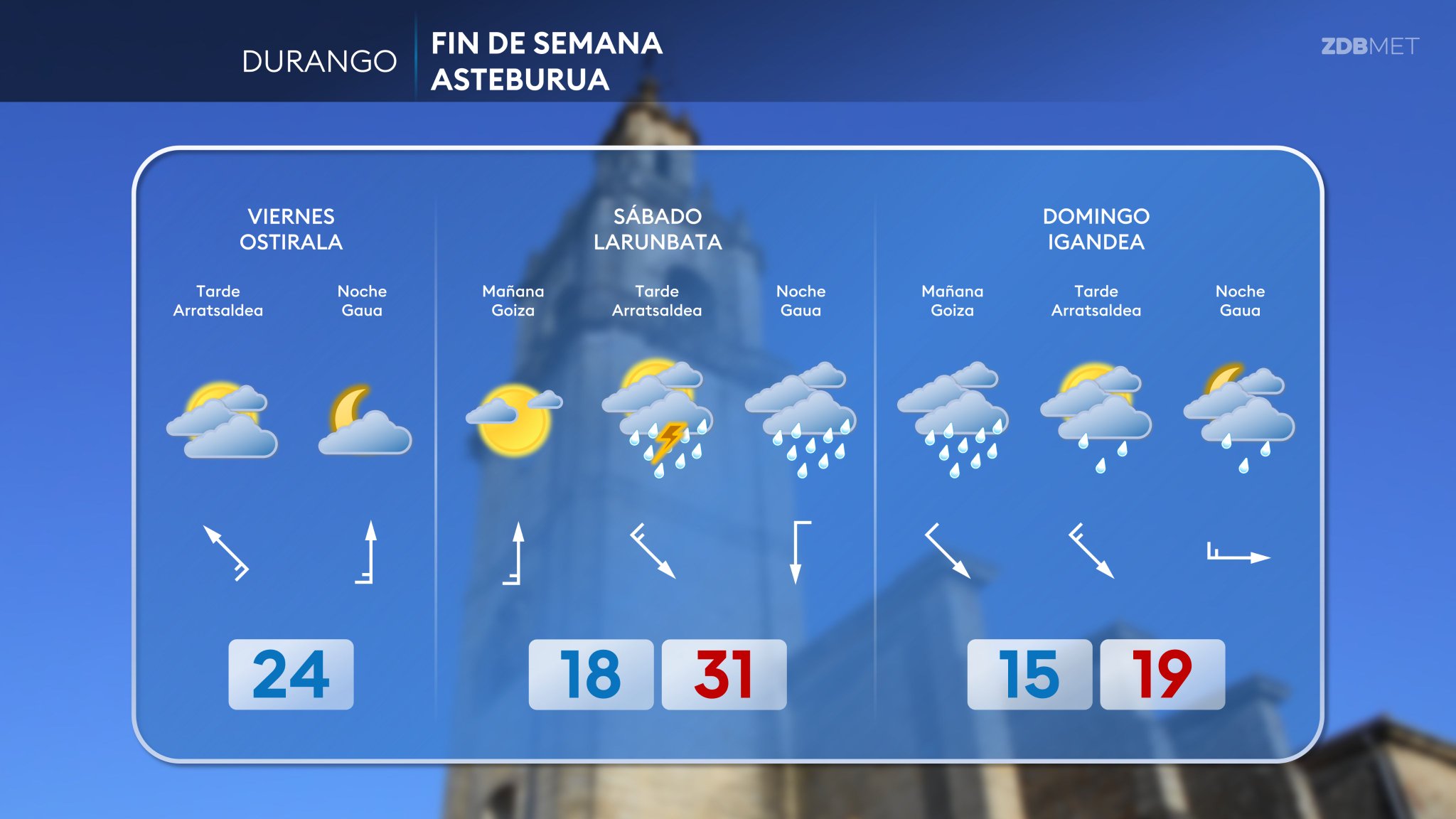 EGURALDIA | Cara y cruz. Verano y otoño para este fin de semana, de las altas temperaturas y del bochorno del viernes, pasaremos a un tiempo más revuelto, con tormentas el sábado a un domingo otoñal gris y lluvioso. En cuestión de horas pasaremos de los más de 30 grados a los 18 del domingo.