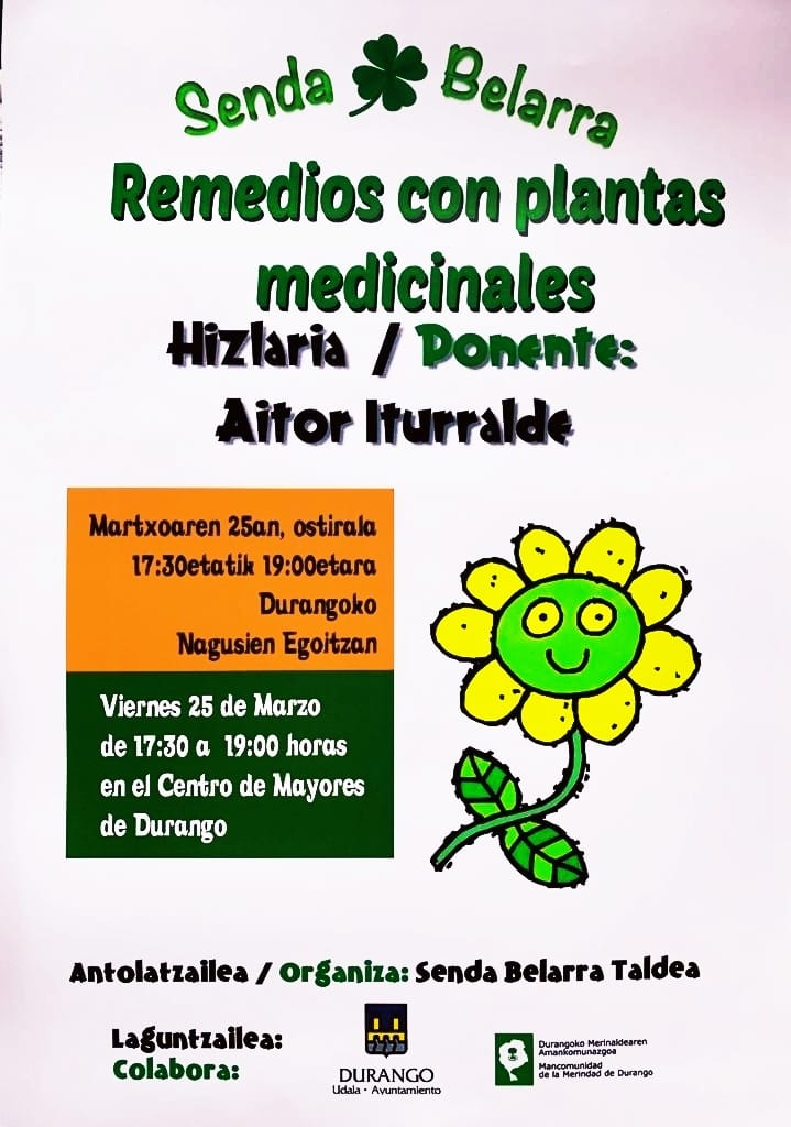 DURANGO | Este próximo viernes, 25 de marzo, organizado por la asociación Senda Belarra tendrá lugar una charla en el centro de mayores de Kurutziaga, bajo el tema «Remedios con plantas medicinales». La jornada comenzará a las 17:30 horas hasta las 19:00 y será impartido por Aitor Iturralde.