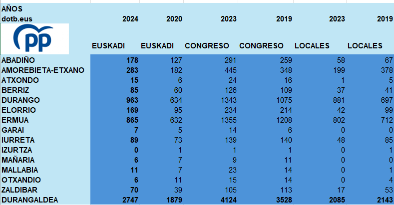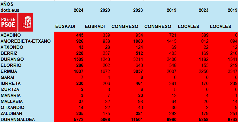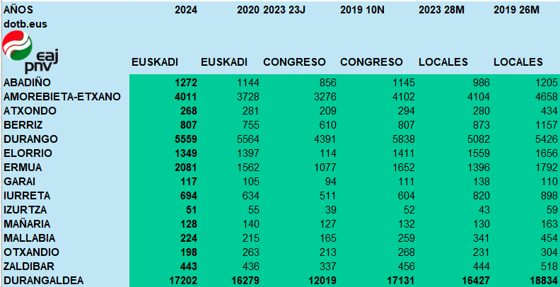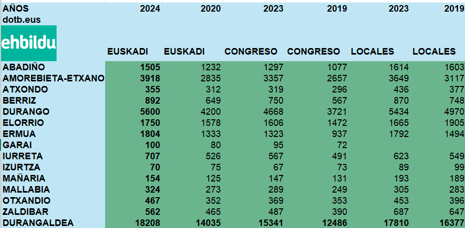 DURANGALDEA | EH Bildu se impone en la comarca con 18.208 votos, frente a los 14.279 de 2020, ganando 4.173 sufragios en estos cuatro años. El PNV deja de ser la primera fuerza en la comarca aunque también gana apoyos, logrando 17.202, frente a los 16,279 de hace cuatro años. El PSE también ha ganado en votos, 5.772 frente a los 5.068 de hace cuatro años. El PP también logra mayor respaldo en estas elecciones, pasando de los 1.879 votos de 2020 a los 2.747.