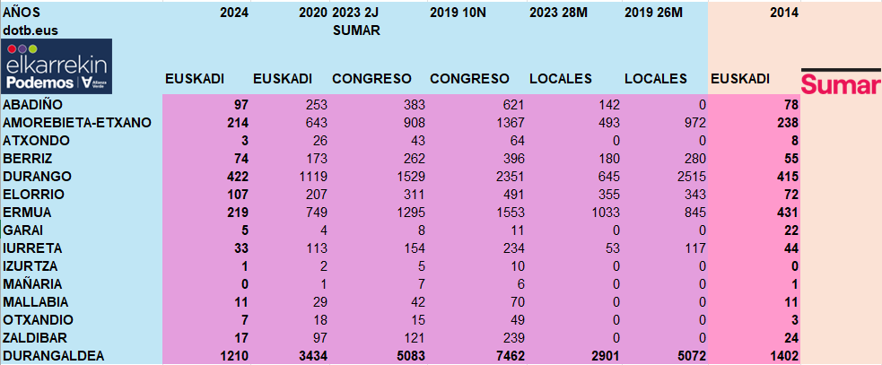 Elkarrekin Podemos consiguió reunir hace cuatro años en Durangaldea un total de 3.434 votos que se han dividido en 1.202 para la formación morada y otros 1.402 para Sumar, dejando en el camino 830 votos.