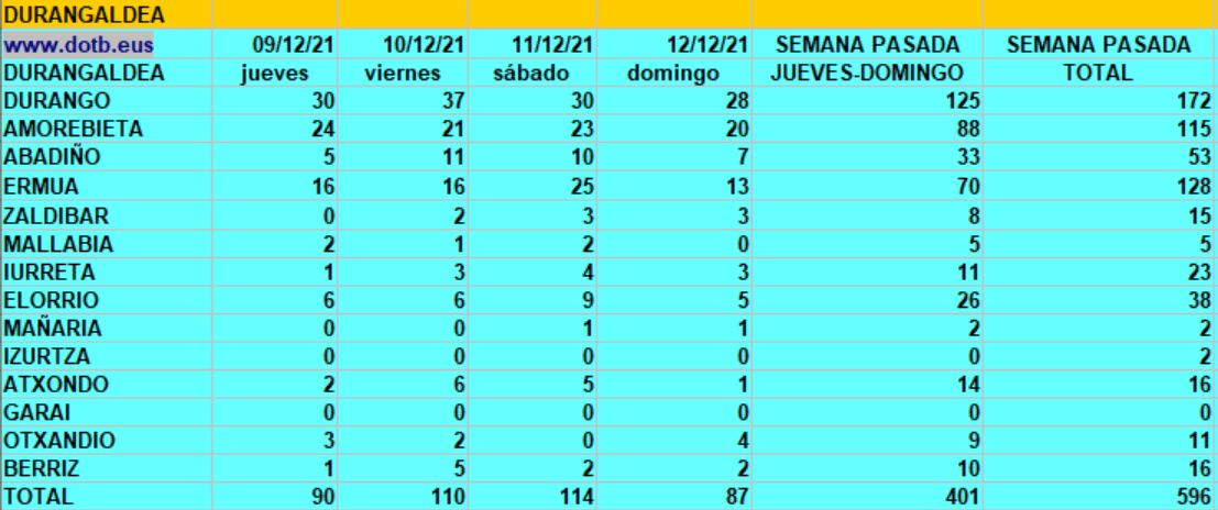 DURANGALDEA.- Desde el pasado jueves hasta el domingo, la comarca ha registrado 401 nuevos casos y cierra la semana con 596 contagios más, frente a los 577 de la semana anterior. Durango suma 125 casos nuevos, Amorebieta 88 casos, Ermua 70, Abadiño 33, Elorrio 26, Atxondo 14, Iurreta 11, Otxandio 9, Berriz 10, Zaldibar 8, Mallabia 5 y Mañaria 2 casos más.