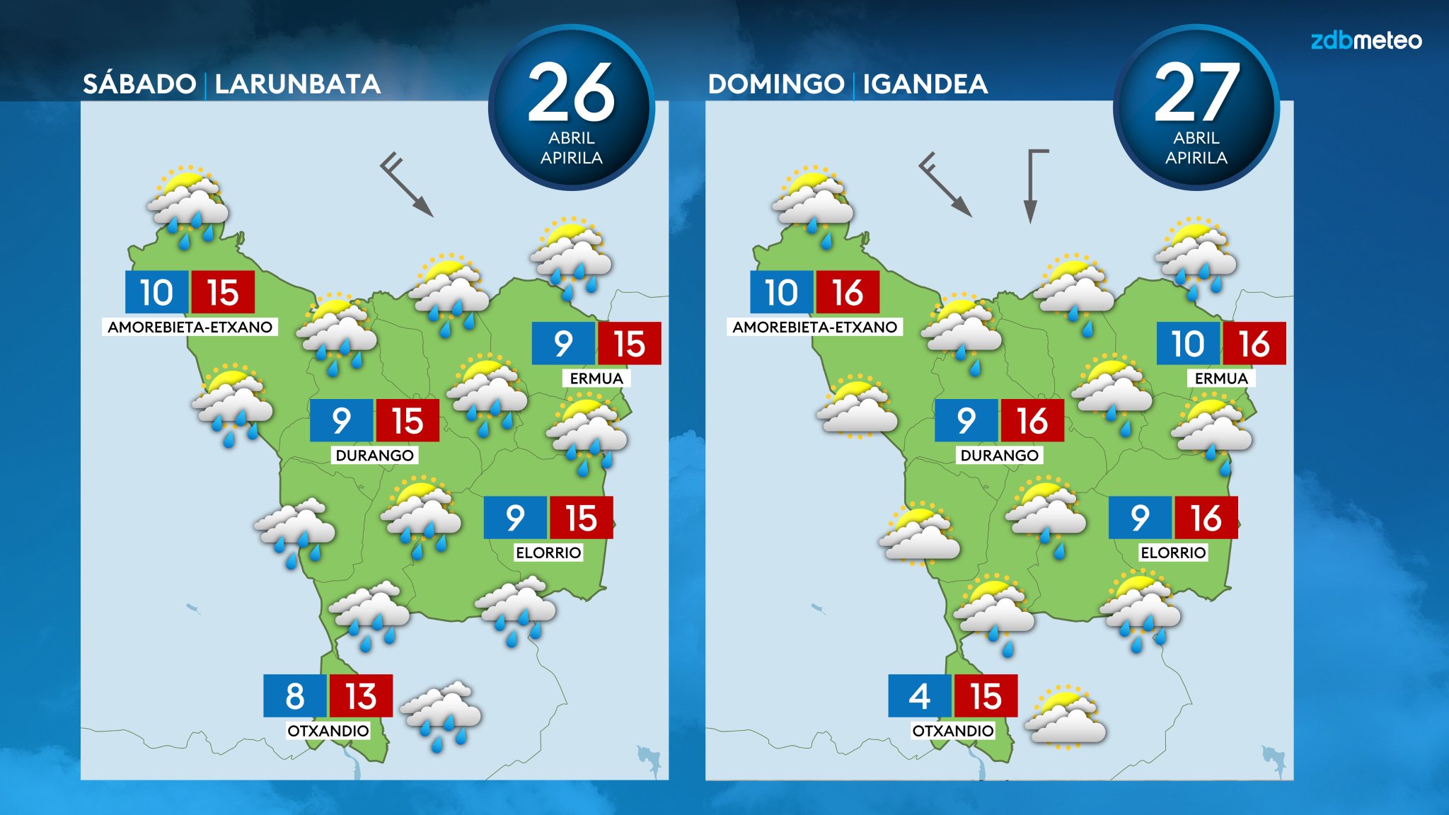 EGURALDIA | El sábado descenso acusado de las temperaturas y chubascos, sobre todo durante la primera mitad del día. El viento del noroeste será bastante molesto casi toda la jornada, sobre todo en la costa, zonas de montaña y en el Valle del Ebro. Cielos cubiertos durante la primera mitad del día, con chubascos, que serán más probables en la vertiente cantábrica, donde ocasionalmente podría darse alguna tormenta. Por la tarde los chubascos empezarán a ser más intermitentes y afectarán sobre todo al nordeste del territorio, tendiendo a una ligera mejoría en el resto, e incluso abriéndose algunos claros, más probables en la mitad sur.
