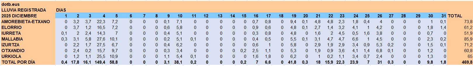 DURANGALDEA | Las tablas de precipitación recogen un inicio de mes muy lluvioso, con un primer temporal entre los días 3 y 5 que deja en torno a 20–30 litros por jornada en varias estaciones, especialmente en Amorebieta‑Etxano, Mallabia, Otxandio y Urkiola. El segundo episodio importante llega a partir del día 18 y se extiende hasta Nochevieja, con jornadas como el 19, 22, 23 y 29 en las que se vuelven a superar los 15 litros en numerosos puntos, elevando el total mensual comarcal hasta casi 470 litros por metro cuadrado. Aun así, comparando con los datos de diciembre de 2024, ha llovido tres veces menos.