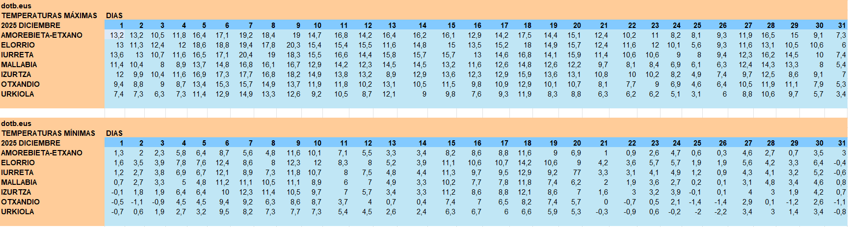 Los datos de temperaturas máximas muestran un diciembre atípicamente templado: en Amorebieta, Durango, Elorrio o Iurreta las máximas se han situado buena parte de los días entre 13 y 17 grados, con picos que superan los 18–19 grados en la primera y la tercera semana. Incluso en estaciones tradicionalmente más frías como Otxandio o Urkiola se observan numerosos días por encima de los 12‑14 grados, lejos de los valores invernales clásicos.