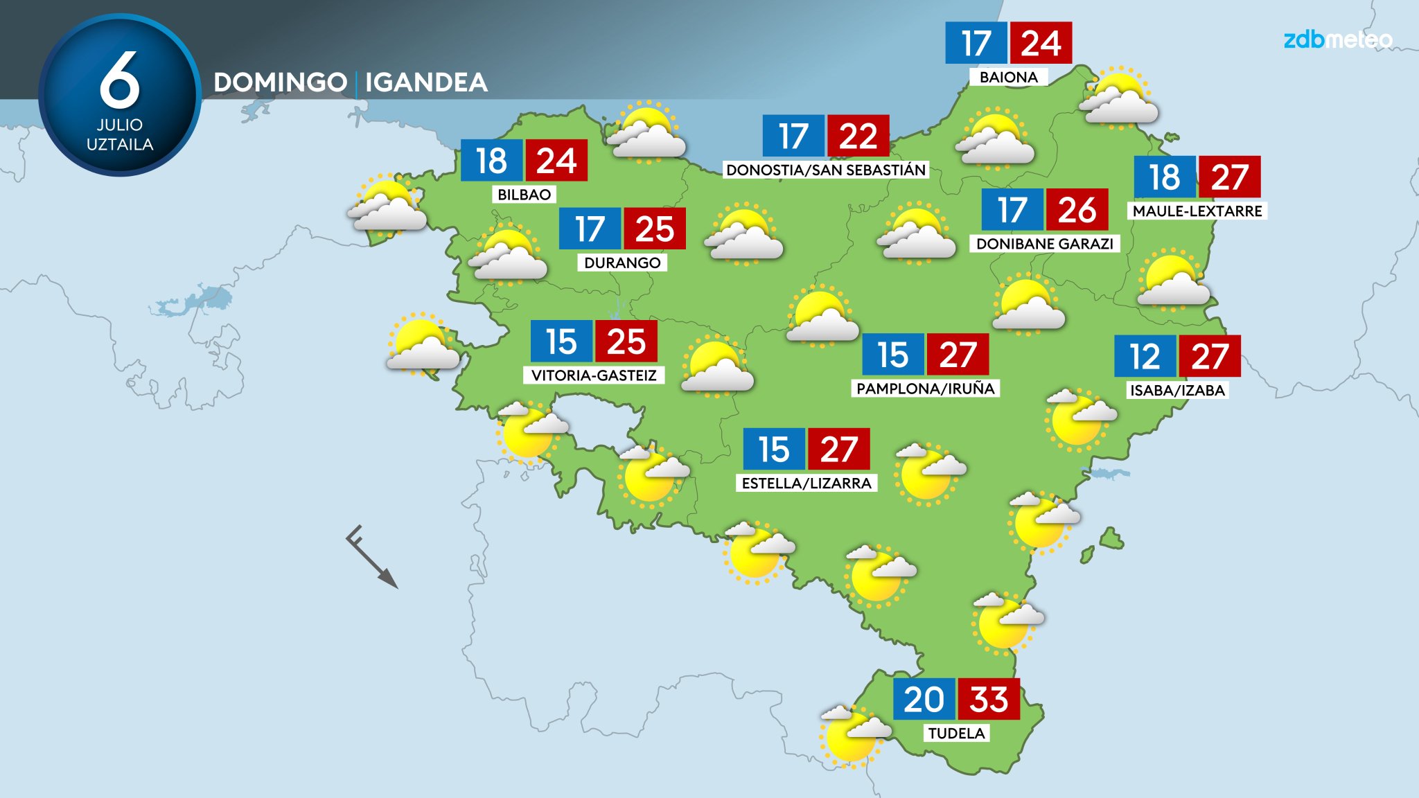 EGURALDIA | El domingo algo más de nubosidad en la vertiente cantábrica, pero todavía con ratos soleados. Tendremos intervalos de nubes bajas por la mañana que deslucirán algo la jornada, pero que dejarán espacio para la apertura de claros, amplios claros en las horas centrales y primeras horas de la tarde, y llegada de nubes bajas durante la segunda parte de la tarde y por la noche. Dicha acumulación de nubes bajas por la tarde-noche dará lugar a lloviznas ocasionales en puntos de la vertiente cantábrica. Viento del noroeste, con temperaturas máximas en ligero descenso.