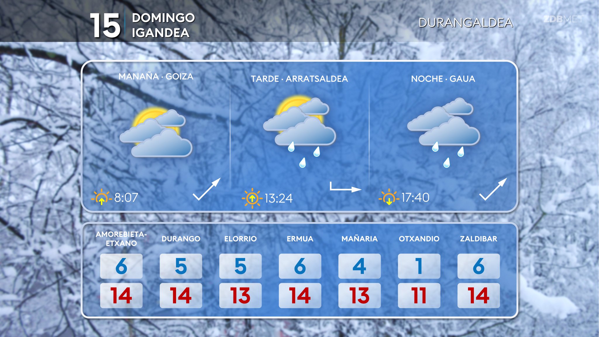 EGURALDIA | El domingo el tiempo tenderá a estabilizarse, amainará el viento y se recuperarán las temperaturas. Cerca de la costa predominarán las nubes, pero durante la mañana es probable que aguante sin llover en amplias zonas del territorio y por el sur se abrirán claros a primeras horas. A lo largo de la tarde las nubes irán a más y puede llover de forma débil en la mitad norte, sobre todo al final de la jornada. Vientos del suroeste, con unas temperaturas máximas que subirán de forma moderada. Las mínimas pueden ser más bajas, sin descartar alguna helada en puntos de Araba.