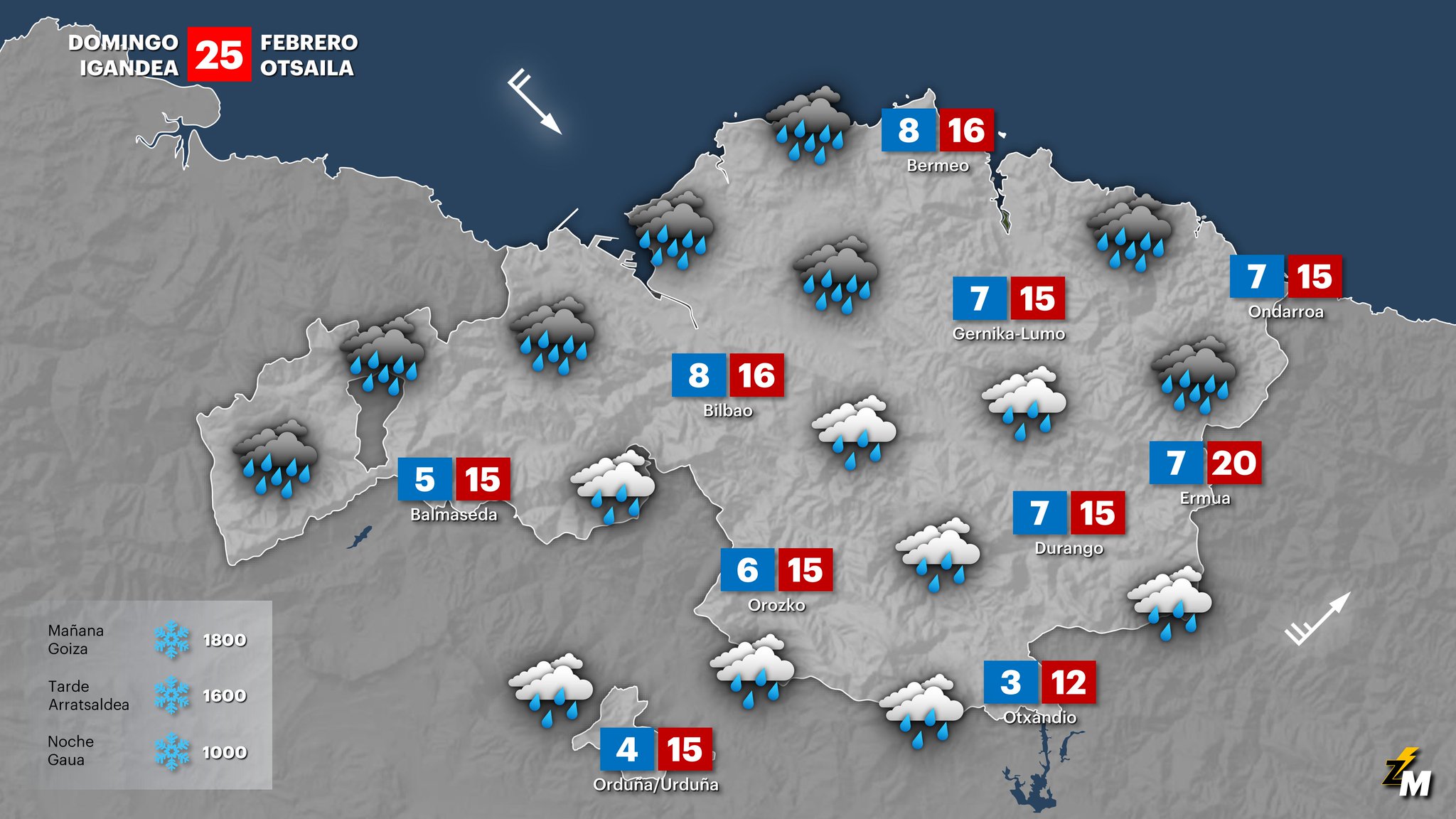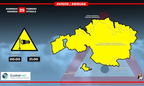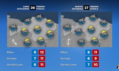 EGURALDIA | Jornada marcada por el viento del suroeste y la lluvia. Arreciará el viento del suroeste que será intenso, sobre todo en zonas expuestas y favorecerá el ascenso de las temperaturas máximas que podrían situarse por encima de los 15 grados. Con estas temperaturas, la cota de nieve irá subiendo de los 1000 m hasta situarse por encima de los 1500 metros. El paso de varios frentes dejará lluvia, sobre todo durante la mañana y por la noche.