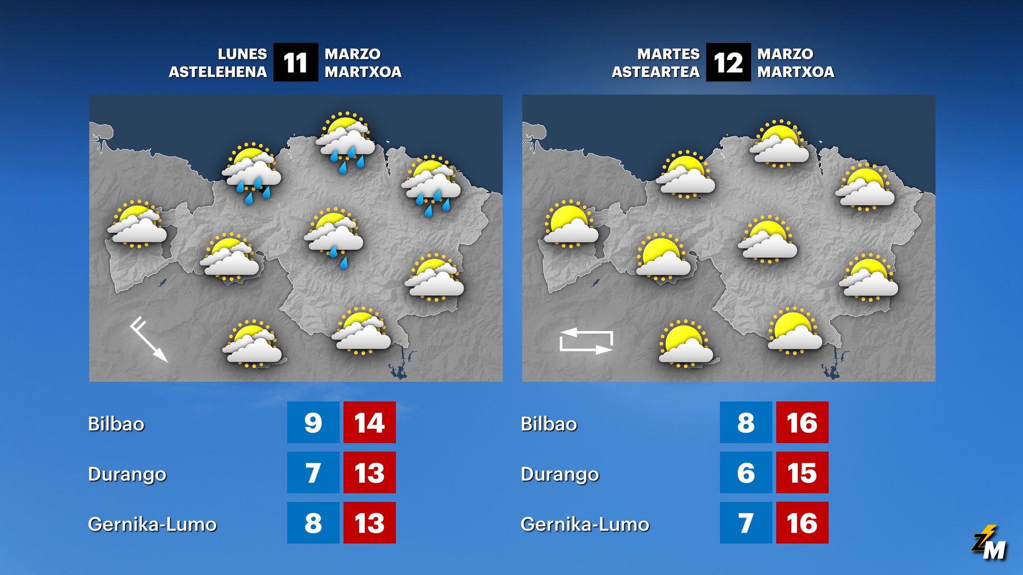 EGURALDIA | El domingo a primeras horas puede llover algo y lo hará con fuerza en la costa. Debido a ese cambio del viento, las lluvias más abundantes se trasladarán a la mitad norte. Ocasionalmente los chubascos podrán venir acompañados de tormenta. La cota de nieve comenzará en unos 1000 m y terminará subiendo a 1200 m durante la tarde. Las temperaturas serán algo más bajas.