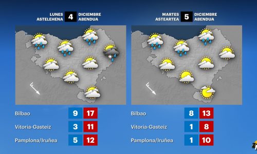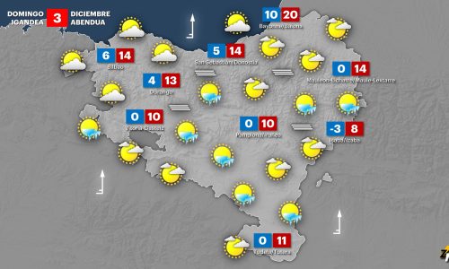 EGURALDIA | Comenzaremos el domingo con brumas y nieblas y temperaturas frías; se esperan heladas en algunos puntos. Las horas centrales del día serán soleadas y gracias al viento sur las temperaturas máximas subirán 2 o 3 grados. A partir de la tarde el viento sur se intensificará notablemente, traerá más nubosidad y al final del día podría llover en algunos puntos.