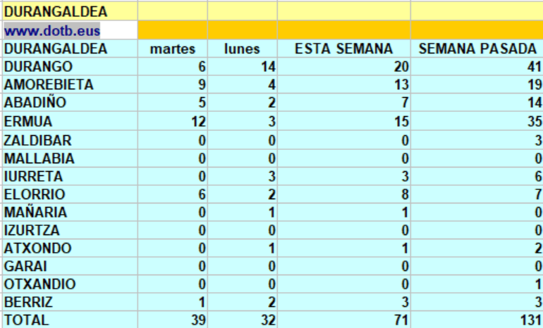 Por localidades Ermua ha detectado 12, Amorebieta 9, Durango y Elorrio 6, Abadiño 5 y Berriz un caso más