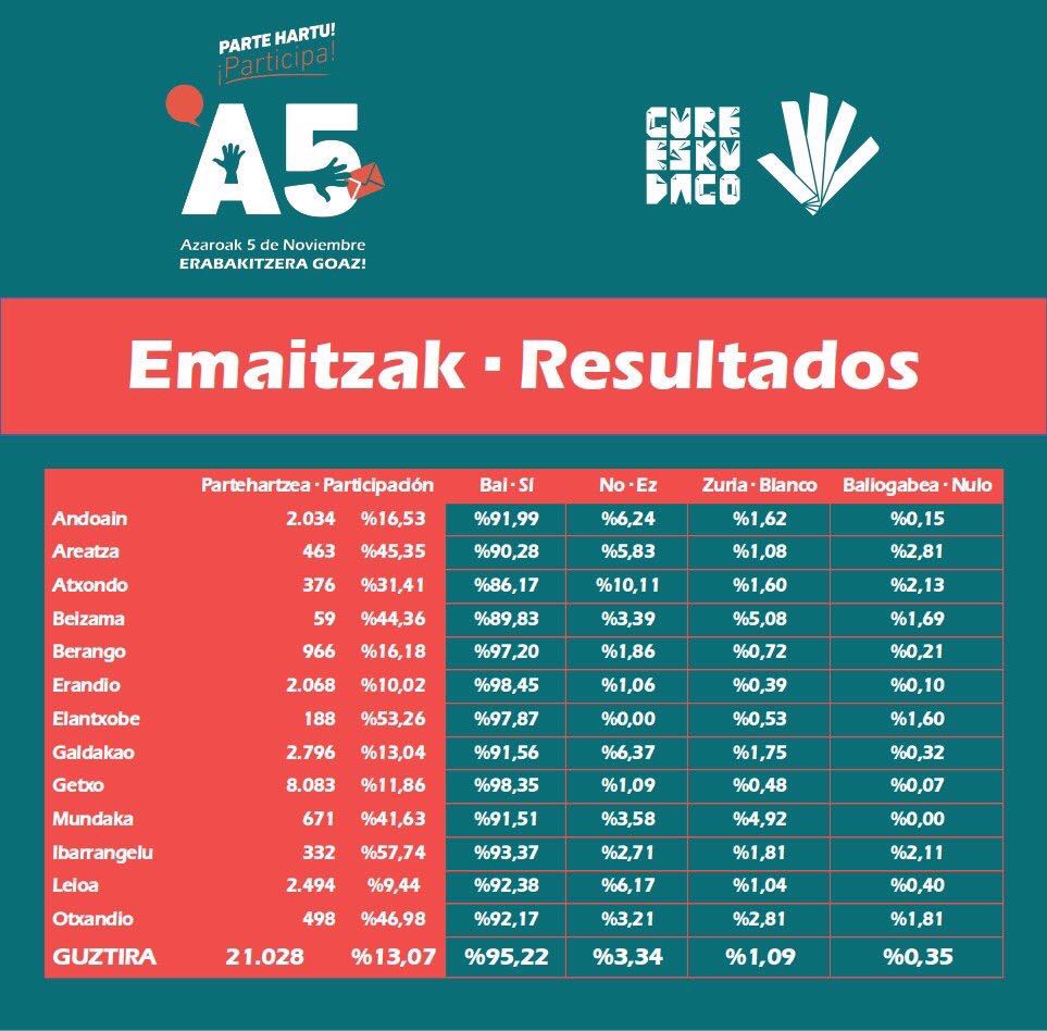 Entre los y las participantes de Atxondo el 86,17 han votado a favor, el 10,11% en contra, y en Otxandio el 92,17% han votado a favor y el 3,21% en contra. Los dos municipios de Durangaldea se suman así a las consultas que se realizaron en Durangaldea el pasado 7 de mayo en Durango, Amorebieta-Etxano, Abadiño, Elorrio y Zaldibar.