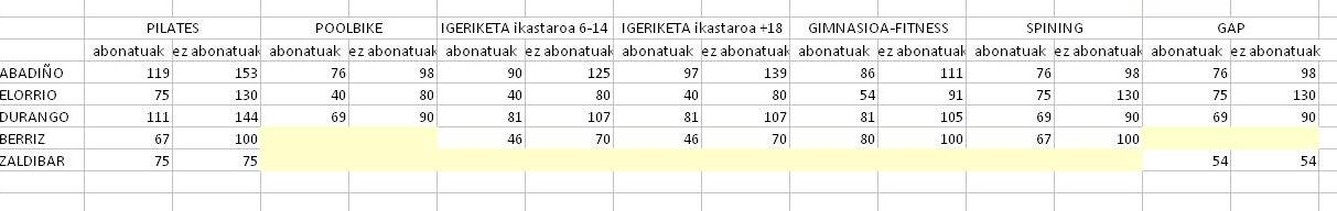 Abadiñoko Eh Bilduk bialdutako ondorengo konparazio taulan agertzen den bezala, Abadiñoko igerilekuko zerbitzu guztiak inguruko garestienak dira: