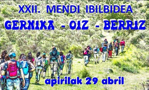 BERRIZ.- El Ayuntamiento de Berriz junto con la Asociación Bizidun han organizado una nueva subida al monte de Gernika a Oiz y de allí a Berriz. La ruta tendrá lugar el 29 de abril, sábado, y los interesados deberán inscribirse antes del día 26. Al finalizar la marcha, los asistentes podrán disfrutar de una comida (opcional) por 22 euros.