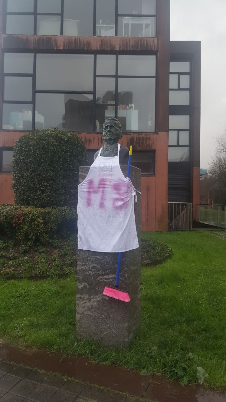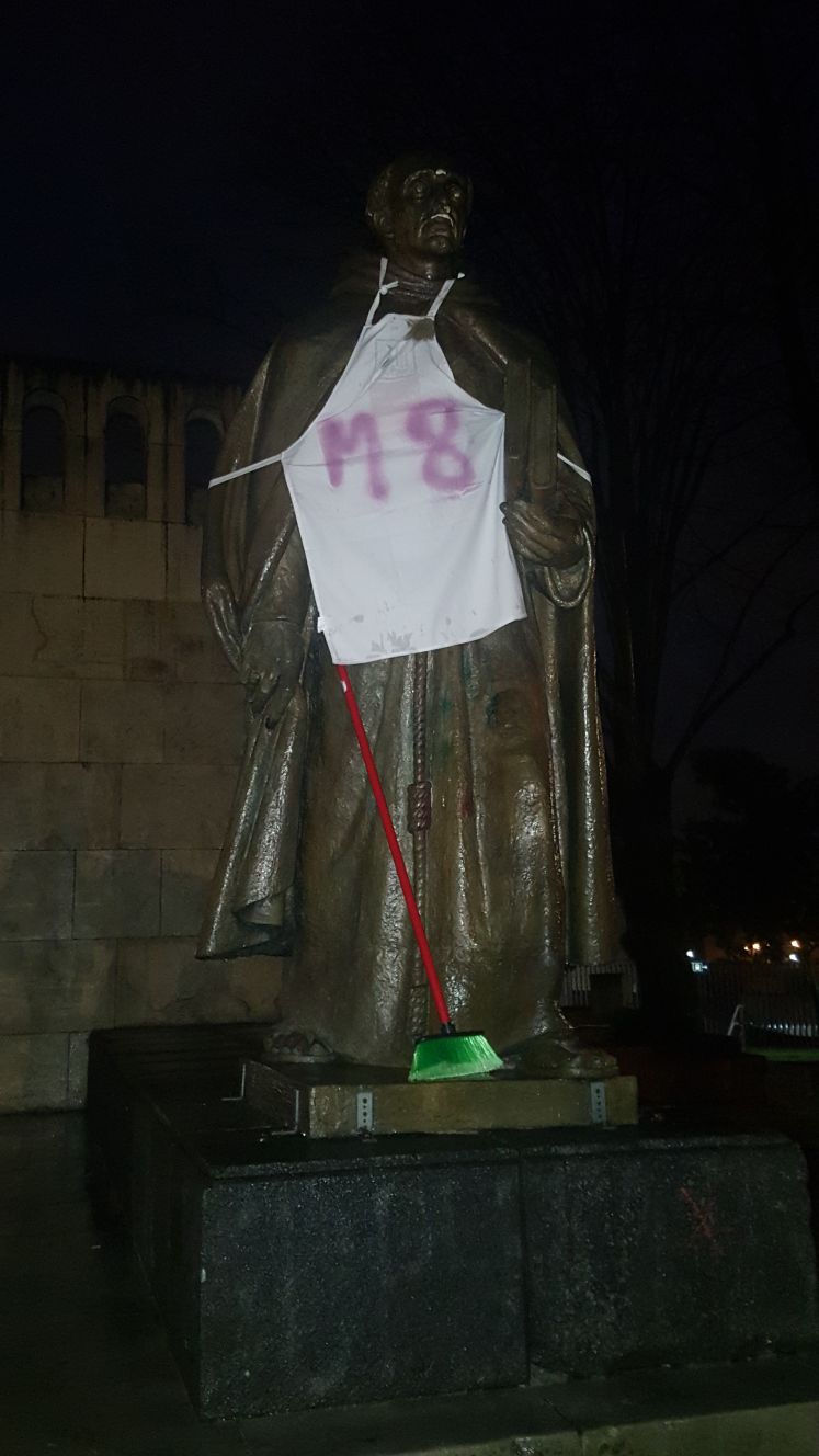 DURANGO.- Quedan pocos días para la celebración del Día Internacional de la Mujer. El próximo 8 de marzo está convocada la primera huelga feminista y por ese motivo esta mañana la Plataforma Feminista de Durango ha llevado a cabo un acto reivindicativo. Varios monumentos de Durango, Pablo Pedro Astarloa, Fray Juan de Zumarraga u otros puntos como la figura que simula al corredor de los Zezenak Dira han aparecido vestidos con delantales con las siglas M8 -Martxoak 8-, y atabiados con una escoba. Se trata de visibilizar la proclama de la huelga feminista del próximo ocho de marzo.
