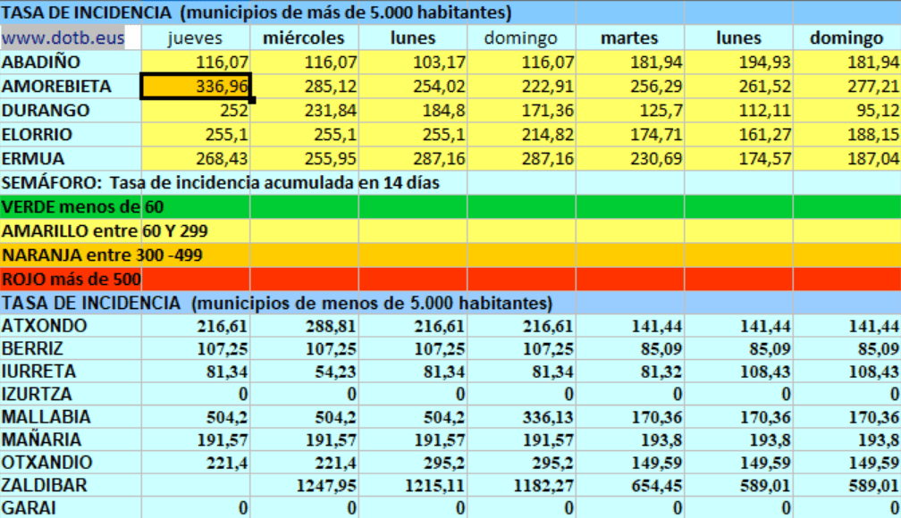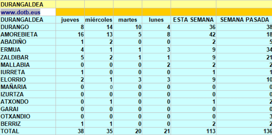 DURANGALDEA.- En las últimas 24 horas se han registrado 38 casos en la comarca. Por localidades Amorebieta registra 16 casos, Durango 8, Zaldibar 5, Ermua 4, Elorrio 2 y un caso en Abadiño, Iurreta y Berriz.