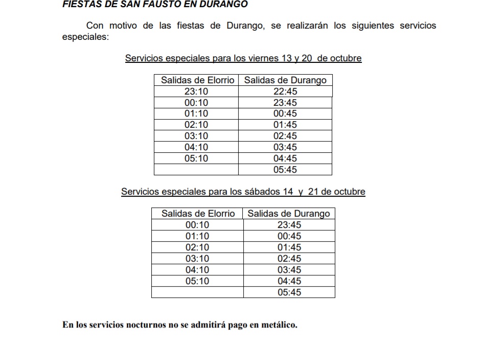 DURANGO.- Con motivo de las fiestas de San Fausto Euskotren ofrecerá trenes especiañes nocturnos y hará lo propio Bizkaibus. Según han informado el pago en estos viajes solo se admitirán a través de la tarjeta Barik.