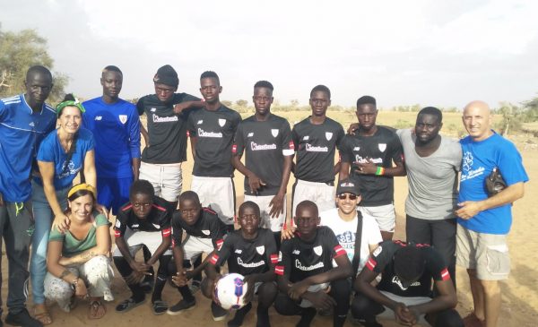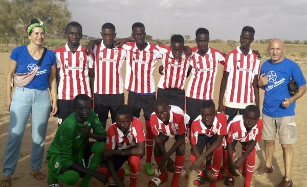 DURANGO.- Fue el pasado 27 de julio cuando la ONG durangarra recogía 106 equipaciones y ocho balones donados por la Fundación Athletic para llevar en agosto a tierras de Senegal. Desde allí, los integrantes que han viajado desde Durango, Miri Larrea, Eukene Rementeria, Mikel Lozano, junto a José Luis Salas presidente de dicha asociación, que visita Senegal por tercer año y M Isabel Parejo han enviado estas fotos donde los jóvenes se muestran «muy contentos» por los equipamientos futbolísticos y sobre todo gracias a los trabajos realizados allí por la organización. “El año pasado les llevamos camisetas de deporte y nos pedían balones para jugar a fútbol y como el año pasado nos ayudó Koikili Lertxundi le comentamos y gracias a él, nos llamó la Fundación Athletic y fue una grata sorpresa el viernes cuando fuimos a Ibaigane a recoger la donación”, recuerda Marisa.