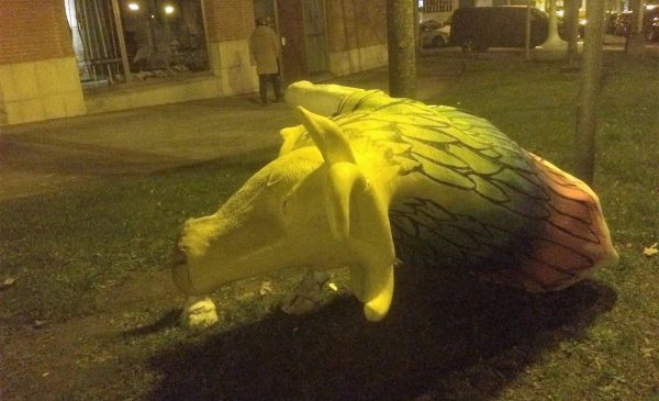 DURANGO.- Una de las vacas situadas delante de la tienda Pizeli ha sido atacada esta pasada tarde, según nos informa un vecino de Tabira a través de ZUREDOT. Este testigo observa perplejo los hechos. «A la hora de comer estaba bien y sin embargo cuando hemos salido a la tarde nos hemos dado cuenta que la habían destrozado», señala este vecino.
