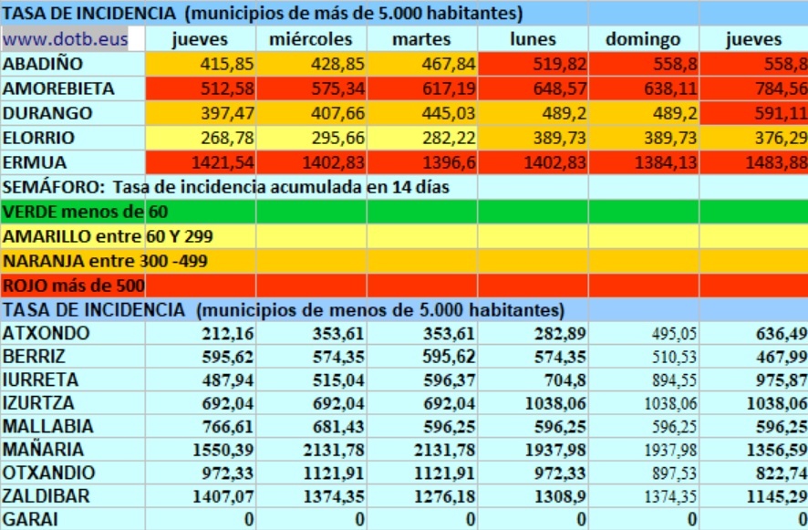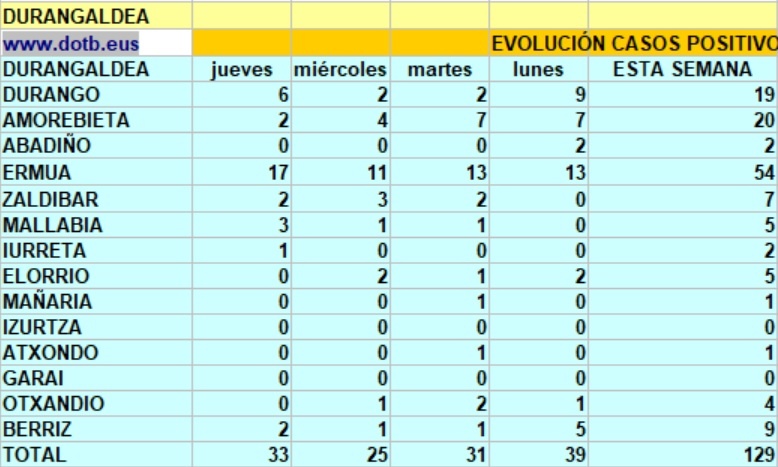 DURANGALDEA.- En las últimas horas se han registrado 31 casos, una ligera subida con respecto a ayer. Por localidades Ermua lidera el municipios con más casos nuevos, 17 desde ayer, le sigue Durango con 6, Mallabia 3, Amorebieta, Zaldibar, Berriz con 2 y un caso en Iurreta.