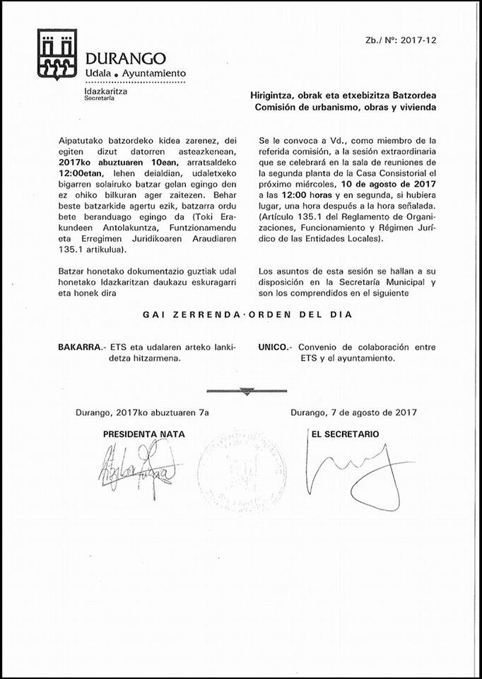 DURANGO.- La sorpresa de la oposición del Ayuntamiento de Durango (Herriaren Eskubidea, EH Bildu), fue mayúscula ayer cuando recibieron la convocatoria para este jueves 10 de agosto, de una comisión para tratar un único punto: El convenio de colaboración entre Euskal Trenbide Sarea y el Ayuntamiento de Durango. «Varías legislaturas sin mover un dedo, sin acometer el asunto y lo hacen en agosto. Es lamentable y máxime después de aprobar una ordenanza de participación, hacer una convocatoria en unos días que la mayoría de la ciudadanía esta fuera o que está descansando. Recuerda mucho a los malos gobiernos y malos gestores que utilizan fechas señaladas para tratar temas importantes y relevantes. Así no se hace política con la ciudadanía. Un ejemplo más de la política trasnochada», señalaba ayer en la redes sociales el portavoz de Herriaren Eskubidea, Julián Ríos.
