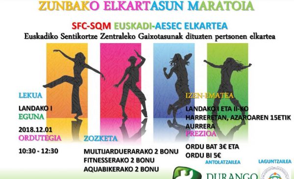 DURANGO.- Será durante dos fines de semana , este sábado y el uno de diciembre cuando, organizado por Durango Kirolak, lleven a cabo dos maratones de spinning y zumba. Los fondos serán para la Asociación SFC-SQM, afectados por enfermedades de sensibilidad central del Pais Vasco, entre las que se encuentra la durangarra Eva María Hazas.