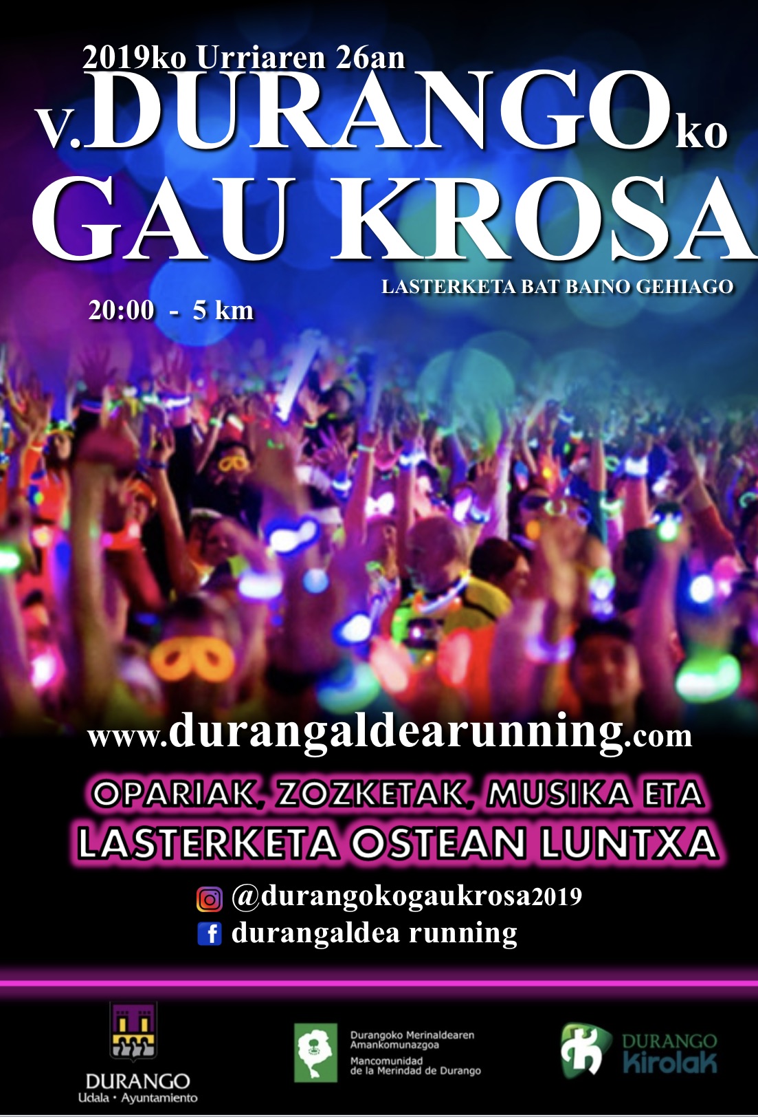Las calles de Durango se transformarán el sábado a partir de las ocho de la tarde en un espectáculo de luces, música y colorido,con pulseras y pinturas luminosas, frontales, leds, música …» No será simplemente una carrera, serás parte del espectáculo de la carrera», añaden.