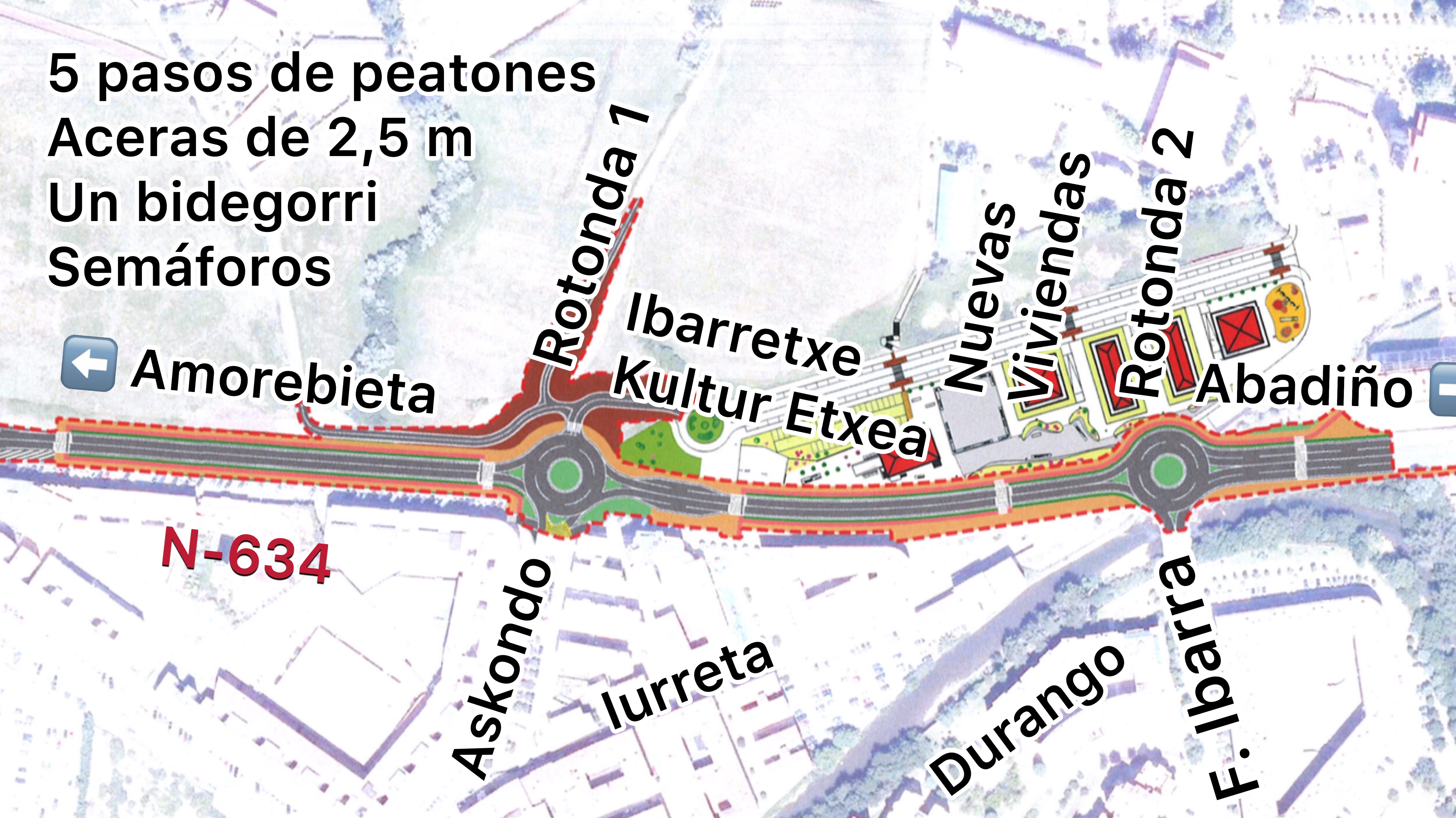 La acera de la nueva travesía tendrá una anchura de dos metros y medio, y se habilitará también un bidegorri de dos metros de ancho. Además en esta nueva travesía se construirán cinco pasos de peatones sobrelevados, tanto para tanto para ciclistas como para peatones, El primer paso, según sentido Donostia, se ubica a la altura del nº 25 de la calle Bidebarrieta, en donde comenzará el ámbito de actuación del presente proyecto. El segundo paso se dispone poco antes de alcanzar la primera de las rotondas, concretamente a la altura del nº5 de la calle Bidebarrieta. El tercer paso se localizará a la altura de las dos paradas de Bizkaibus en el aparcamiento en superficie, coincidiendo con el paso inferior y ascensor, a los que sustituirá. El cuarto paso propuesto se sitúa unos sesenta metros antes de la segunda rotonda. Este paso dará continuidad a la acera que proviene de la calle Bixente Kapanaga y bordea el paso rodado inferior y por último. El quinto paso se ubicará a unos cuarenta metros después de la segunda rotonda, facilitando la accesibilidad con la plaza del Ayuntamiento. Además en todo este tramo se instalarán semáforos que “ayudarán a regular el tráfico y mantener una velocidad de tránsito moderada a lo largo del tramo”.