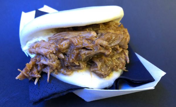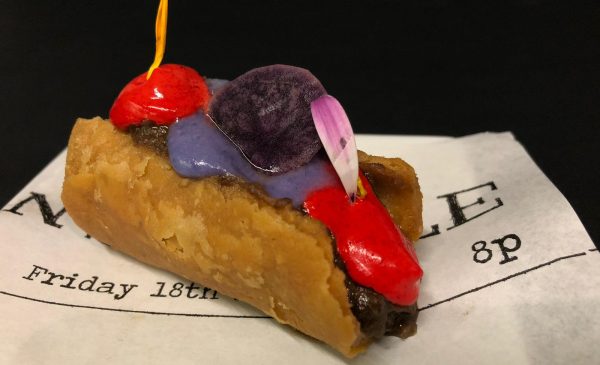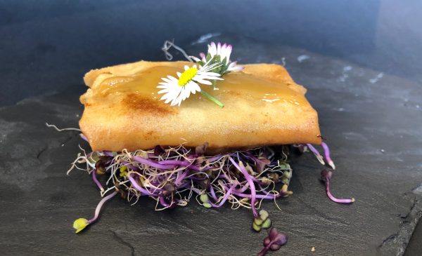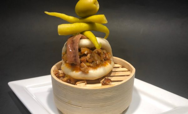 Wantan relleno de carrillera sobre lascas de queso Idiazabal acompañado de compota de manzana agria y reducción de Pedro Ximenez.