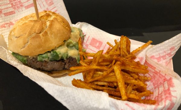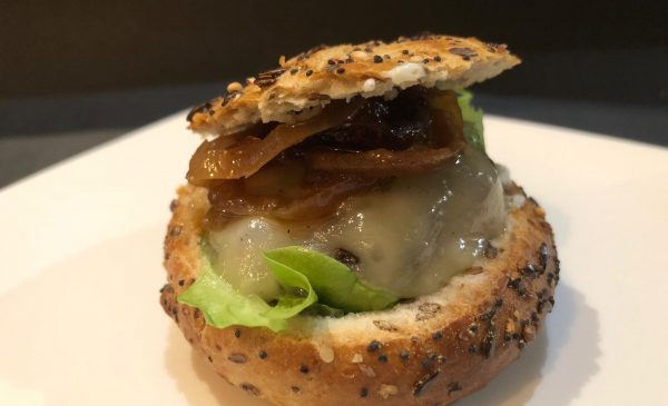 Pipadun ogi barruan, letxuga, kipula errea, gazta, etxeko hanburgesa eta saltsa berezidun mokadua