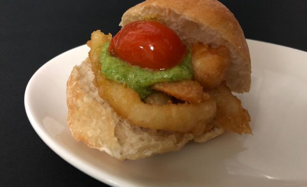 Pan de amapola con chipirones fritos, brotes de ajoarriero, cebolla deshidratada y salsa de cebolla caramelizada con ajo
