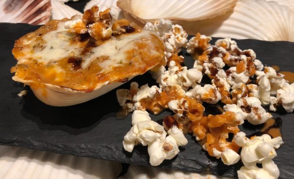 Vieira rellena de moluscos con farsa de verduras y coral de marisco gratinado al horno