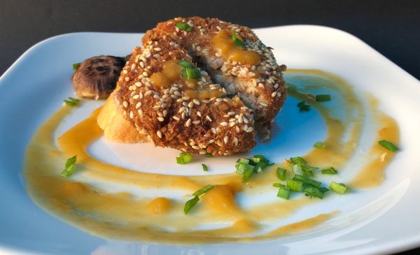 Meloso de panceta sobre hummus crujiente de boniato y salsa teriyaki