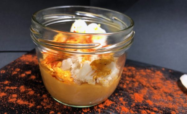 Bakailaozko baratxuri-piperren edalontzitxoa bexamelarekin, tipula deshidratatua eta perrexil olioa