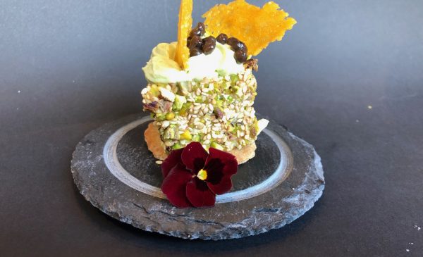 Gildazko krema eta ahuakate pistatxorekin beteriko tarta, gaztai teilak eta oliba beltzen esferikikazioa gazi-gozo gailetaren oinarriarekin