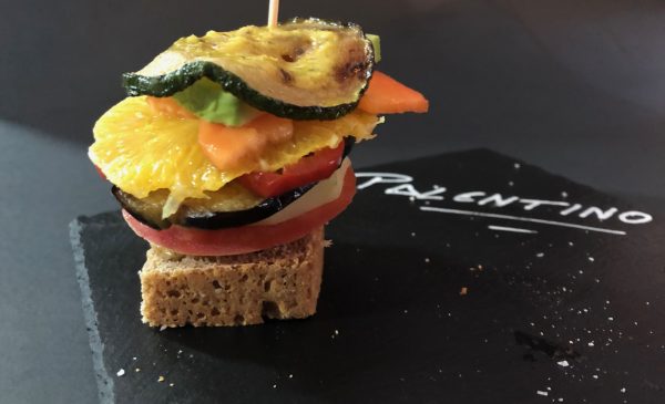 Tosta de pan de espelta con vegetales y fruta tropical con vinagreta de cítricos y aceitunas verdes