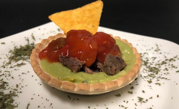 Tartaleta salada con un volcán de guacamole suave, ragout de jabalí, acompañado de una salsa de jalapeños y nacho de queso