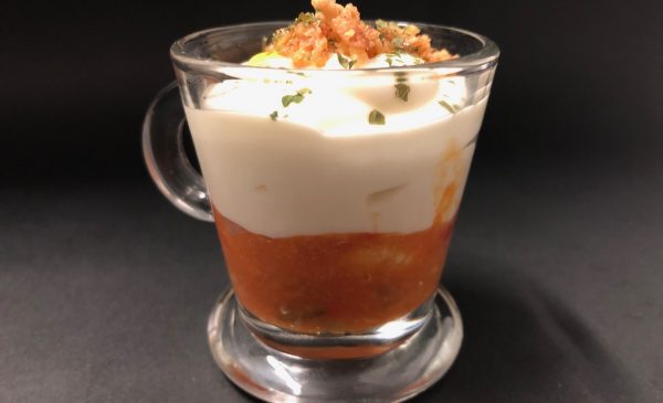 Vasito de ajoarriero de bacalao acompañado de bechamel, cebolla deshidratada y aceite al perejil.